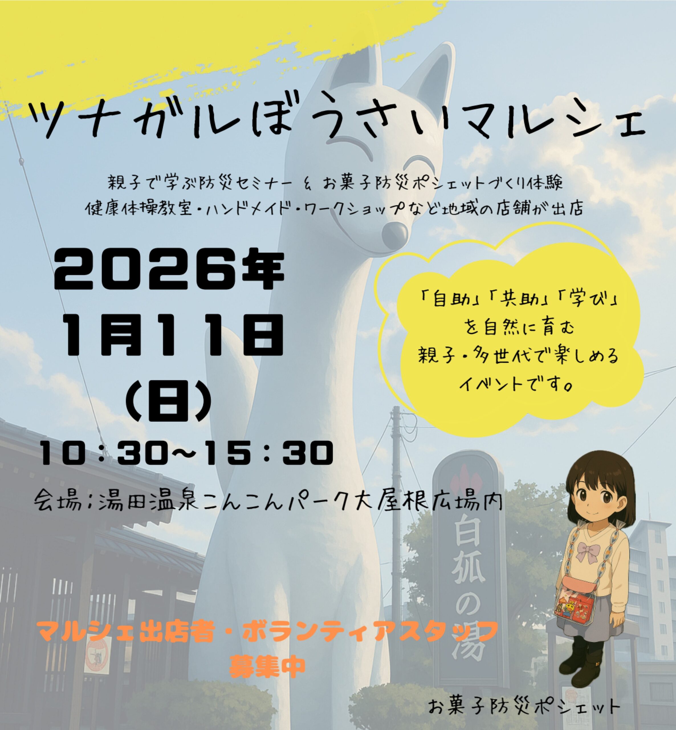 テーマは――🌱人と人🌱人と地域🌱地域の未来をつくる理想と夢それらがツナガルあたたかい交流の場づくり。 📅 2026年1月11日(日)📍 (一社)おいしい防災塾協力山口県山口市湯田温泉こんこんパークツナガルぼうさいマルシェ🪖 テーマは「防災 × 健康 × 学び × 地域交流活性化」世代や分野を越えて、ご縁がツナガル場を目指します。