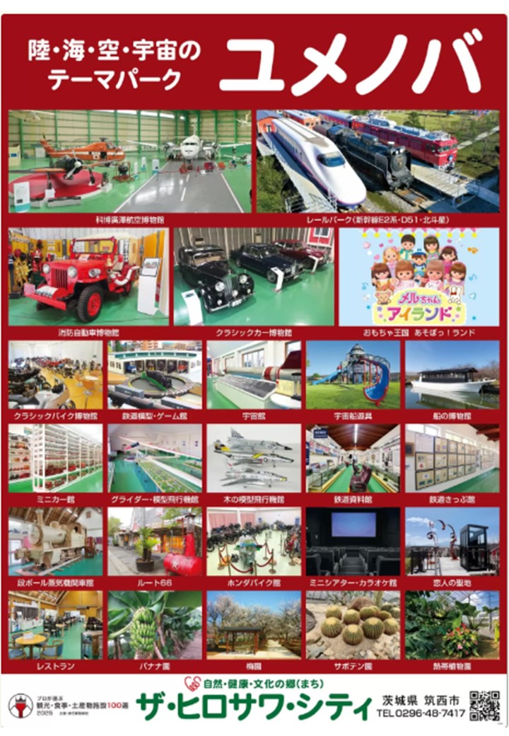 茨城支部では秋の施設見学会を開催いたします。今回は筑西市にある「ヒロサワシティ ゆめのば」を訪問いたします。航空博物館、鉄道車両、クラッシュカーなどの乗り物関連のミュージアムや植物園など見どころが満載です。昼食をとる方は、レストランもあります。なお、隈研吾氏が設計した美術館が有名ですが、今回は別料金になります。ご検討の上、ご参加ください。ご家族の皆様のご同伴も歓迎いたします。日時:2025年11月22日(土) 13:30~ 会場:ヒロサワシティゆめのば(茨城県筑西市徳持433−3)ゆめのばHP:https://www.shimodate.jp/index.html会費:1人1,000円(ご家族も同額) 障害者手帳をお持ちの方:無料※美術館料金はふくまれません。見学者負担となります(1,500円)お申込み:支部事務局まで、お名前、参加人数、来場方法(車、電車・バス、他) 当日連絡できる携帯番号をe-mailで連絡願います。e-mail:ibaraki@sanno-koyu.jp 又は、takumaro3@yahoo.co.jp