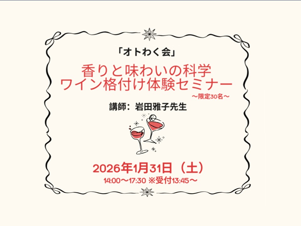 新春開催のオトわく会学習会および懇親会のご案内です。今回は、岩田雅子先生をお迎えし、五感を使って「科学」を学ぶ特別なセミナーを開催いたします。ワインの試飲を交えながら、香りと味わいの奥深い世界を体験してみませんか?■学習会:詳細【テーマ】 香りと味わいの科学:ワイン格付け体験セミナー 講師:岩田雅子先生【日時】 2026年1月31日(土)14:00~17:30【会場】 自由が丘キャンパス 7号館(予定)【定員】 30名(先着順となりますので、お早めにお申し込みください)【備考】 当日はワインの試飲を予定しております。 ※お車・バイクを運転される方や、アルコールが苦手な方のために、ソフトドリンクもご用意しております。■懇親会のご案内学習会終了後、懇親会を開催いたします。先生や参加者同士で親睦を深めましょう。時間: 18:00~20:00場所: ディプント自由が丘店■詳細・お申込み詳しい内容およびお申込みについては、添付チラシのQRコードよりご確認ください。皆様のご参加を、心よりお待ちしております。