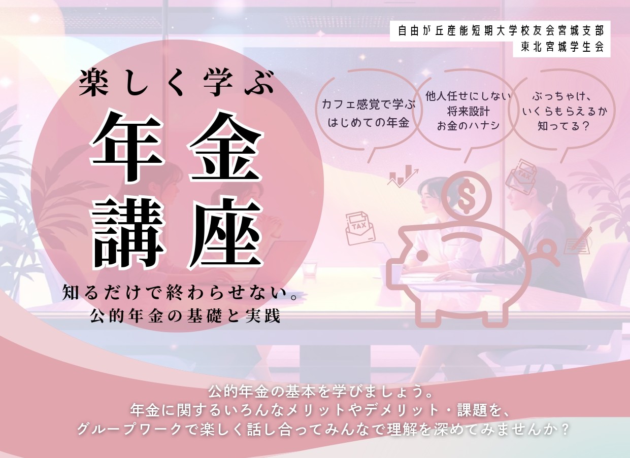 公的年金の基本を学びましょう。年金に関するいろんなメリットやデメリット・課題を、グループワークで楽しく話し合ってみんなで理解を深めてみませんか。楽しく学ぶ 年金講座~知るだけで終わらせない、公的年金の基礎と実践~講師 自由が丘産能短期大学 准教授 依田朗裕先生 (豊かな経験と穏やかな雰囲気の先生で、初めての方でも楽しく参加できます。)開催日 2026年5月30日(土) 会場 トークネットホール仙台会費 無料 / 昼食代 別途 1,400円(仮)スケジュール10:30〜 受付11:00〜13:00 セミナー前半(前半2時間)13:00〜14:00 昼休憩14:10〜16:10 セミナー後半(後半2時間) 16:20〜 総会17:30〜 懇親会お申込み チラシのQRコードまたは下記のアドレスからお申込みください。 受付期間:2026年2月21日(土)〜4月17日(金)お問合せ短大校友会宮城支部 ja7hqx@ezweb.ne.jp東北宮城学生会 tohokumiyagi.group@gmail.com