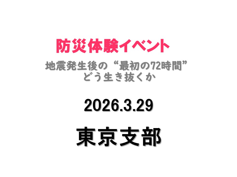 「地震発生後の“最初の72時間”をどう生き抜くか 」楽しみながら答えを見つける体験ツアーが開催されます。そなエリア東京のリアルな防災体験ゾーンで、ゲーム感覚で学べるプログラムです。仲間と一緒にワイワイ体験しながら、気づけば防災力がぐっと上がっているはず。体験後は、近隣施設にてランチ会を楽しみましょう。◇イベント詳細📅 開催日: 3月29日(日) 🕚集合時間 10:40防災体験ツアー11:00〜12:20ランチ会 12:30〜14:30💴 参加費 : 3,000円/人👥 定 員 : 15名(先着)📍 会 場 : そなエリア東京(江東区有明)🎯 対 象: 東京支部の皆さま(他支部の方も歓迎)📝 申込締切: 3月22日(日)◇開催場所 防災体験学習施設 そなエリア東京 東京都江東区有明3丁目8番35号 東京臨海広域防災公園 東京臨海高速鉄道りんかい線「国際展示場」駅より 徒歩4分 ゆりかもめ東京臨海新交通臨海線「有明」駅より 徒歩2分 ◇お申込み QRコードからお願いいたします