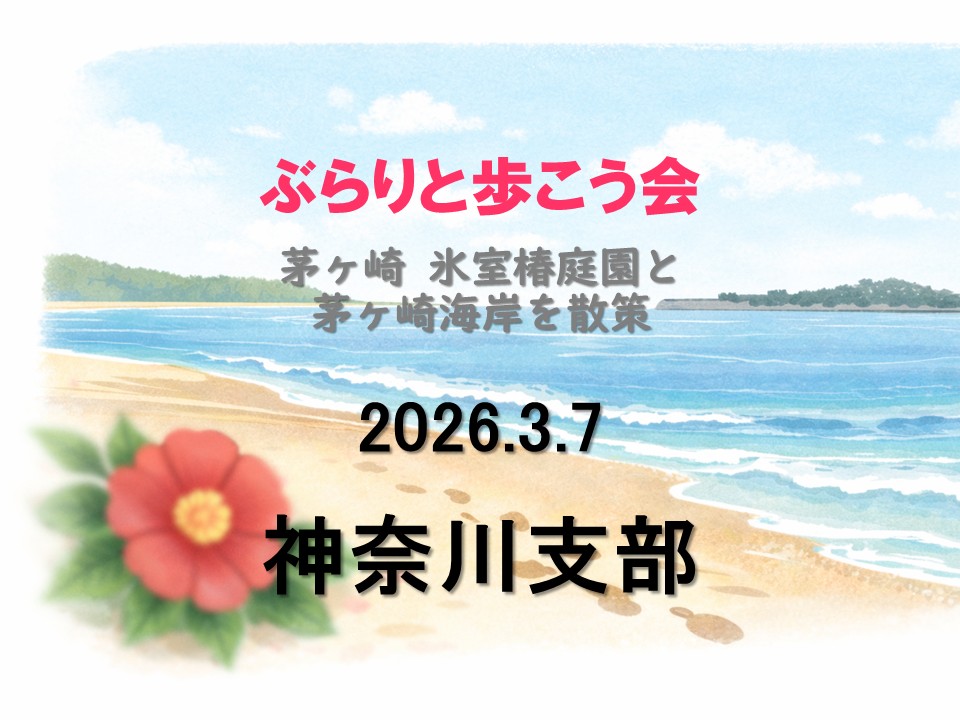 次回のぶらりと歩こう会は、茅ヶ崎市在住の会員のご案内により、3月7日(土)に開催いたします。今回は「茅ヶ崎 氷室椿庭園と茅ヶ崎海岸を散策」です。 集合は9時30分、JR東海道線・茅ヶ崎駅改札口前です。 氷室椿庭園は、茅ヶ崎の海に近い閑静な住宅街の一角にある、約2,800平方メートルの庭園です。園内には200種以上の椿をはじめ、松やバラなど約1,300本の低木類が植えられており、見ごろを迎える椿をお楽しみいただけます。 庭園散策の後は、茅ヶ崎海岸まで足を延ばします。なお、歩き疲れた場合には、海岸付近から茅ヶ崎駅までのバスも利用できますので、安心してご参加ください。 【お申し込み】3月4日(水)までに、世話人・髙橋国夫までメールにてお申し込みください。Mail:kanagawa@sanno-koyu.jp