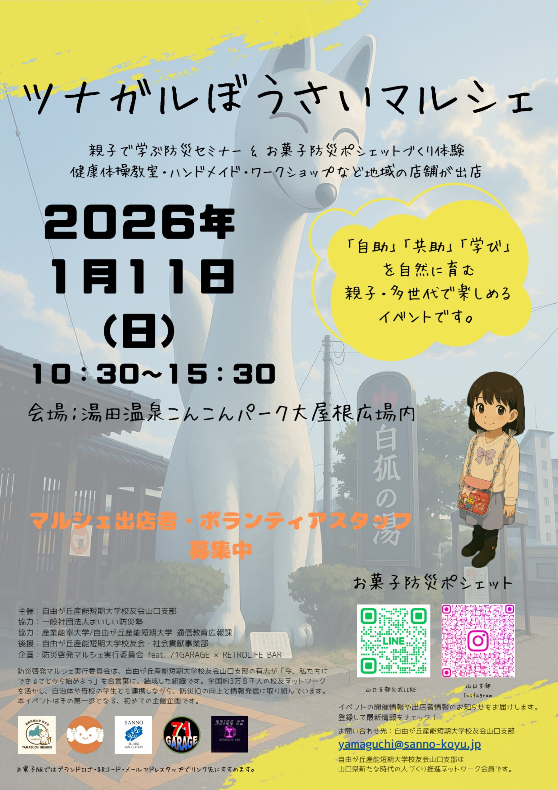📅 2026年1月11日(日)📍 (一社)おいしい防災塾協力山口県山口市湯田温泉こんこんパークツナガルぼうさいマルシェ🪖