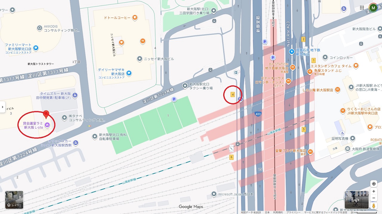 地下鉄御堂筋線 新大阪駅 4番出口を出て左へ曲がり新幹線の線路沿いに直進、