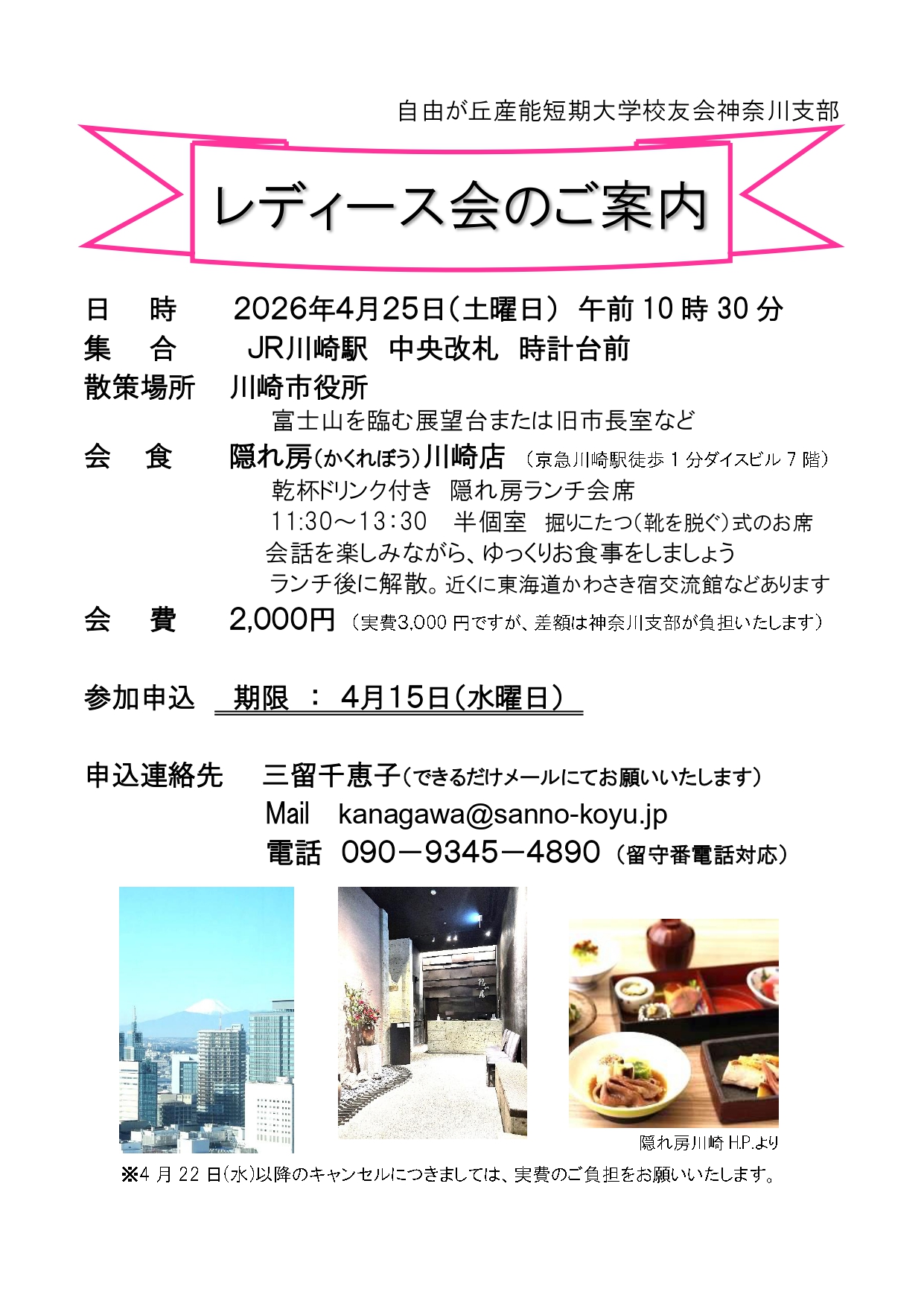神奈川支部は、恒例のレディース会を2026年4月25日( 土)に開催します。