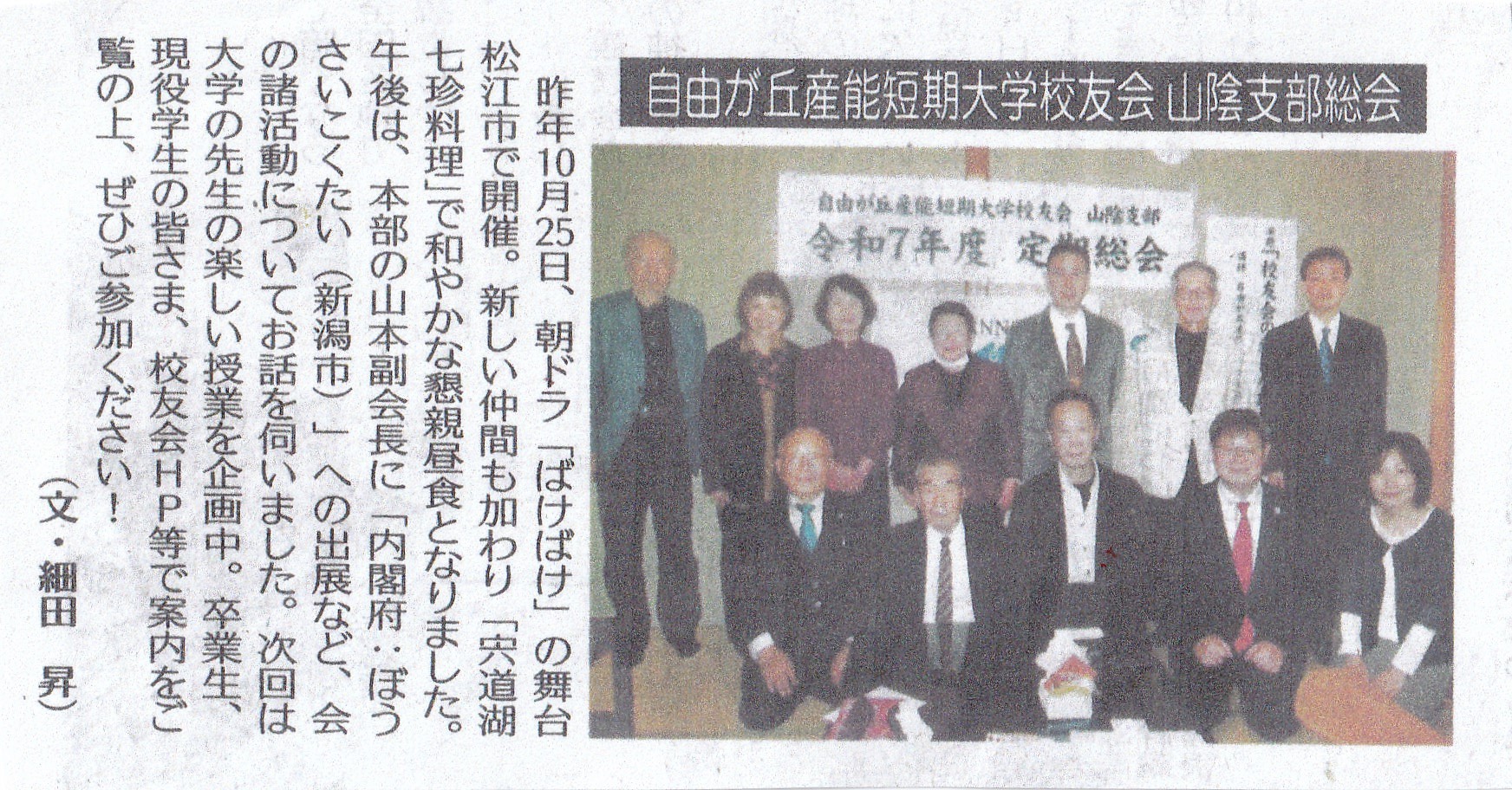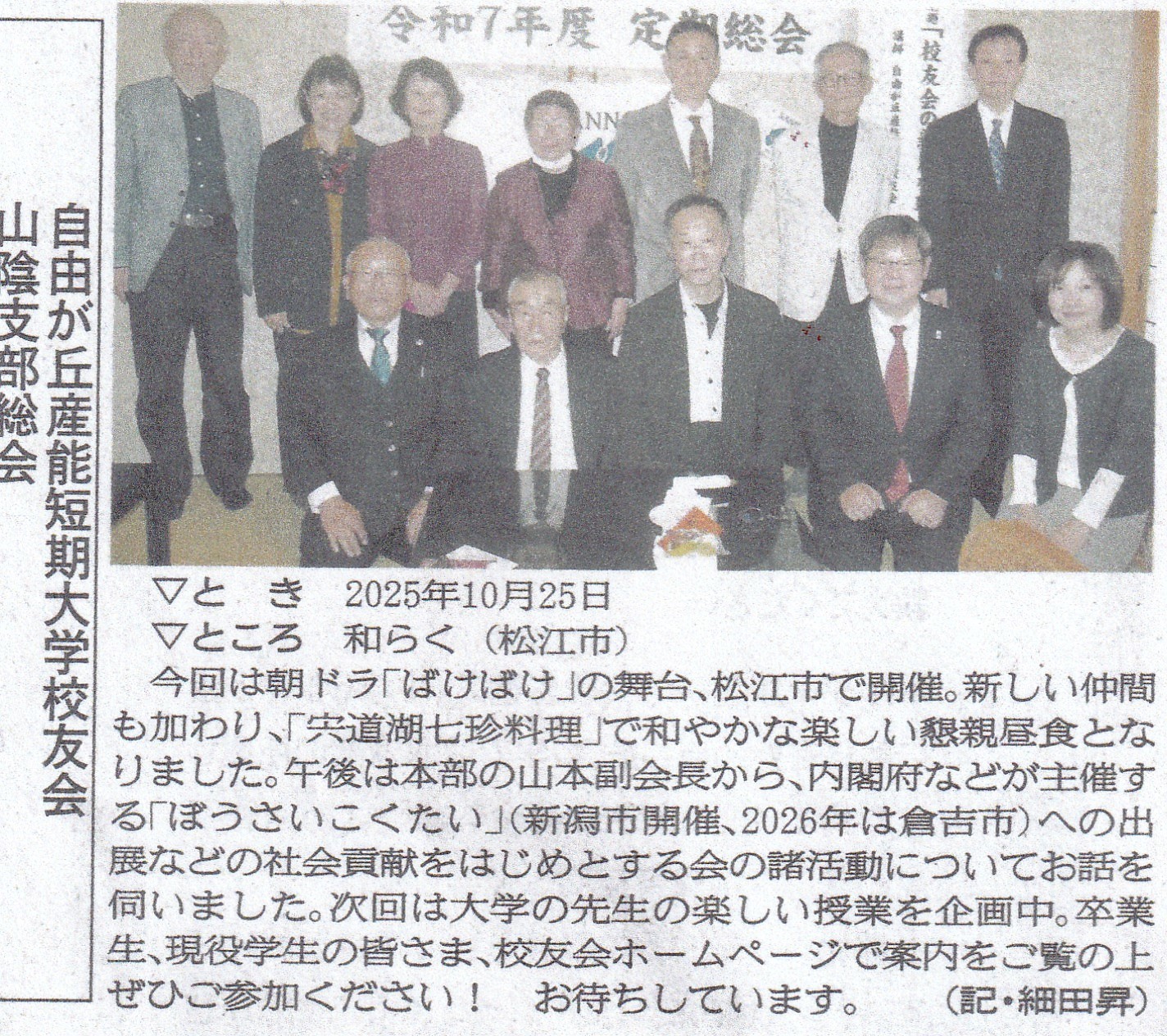 令和7年10月25日に松江市で開催された山陰支部令和7年度総会の様子が、山陰両県の新聞に取り上げられました。