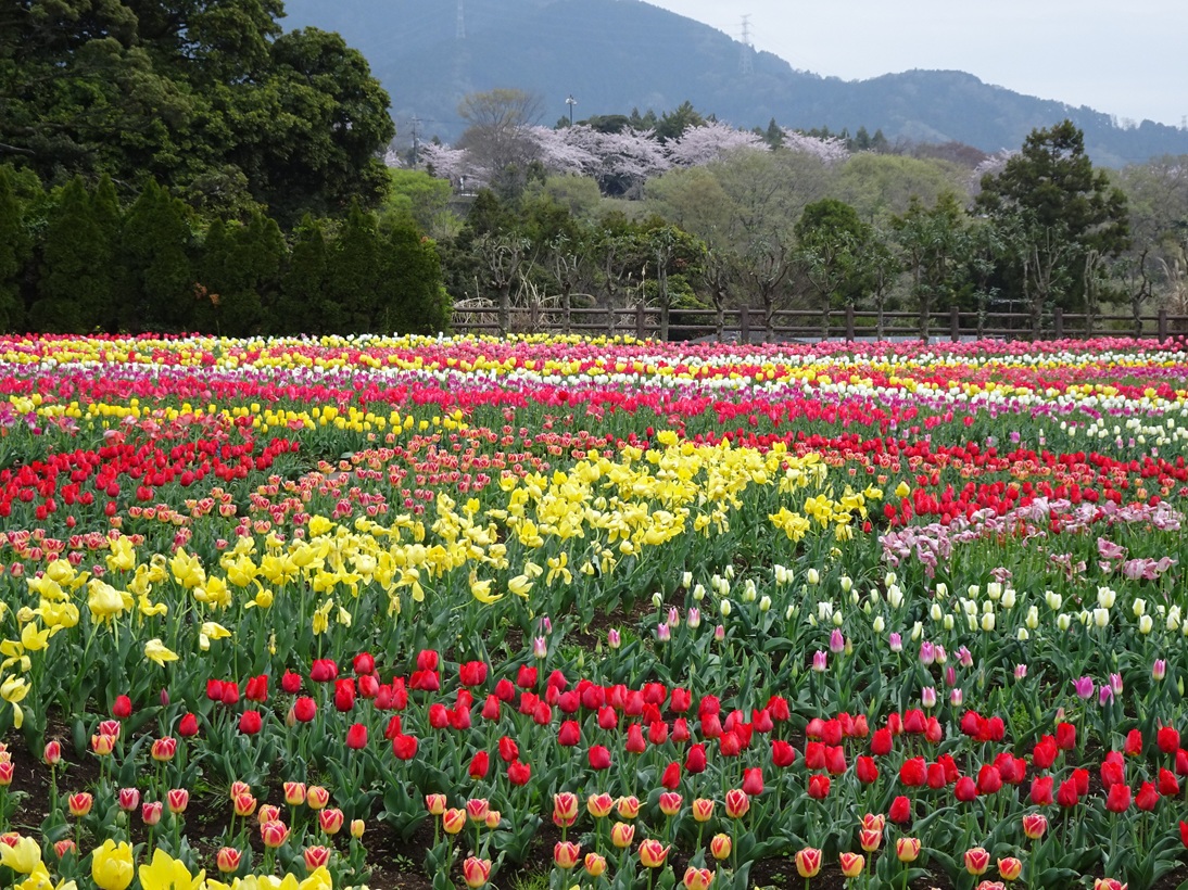 公園では「はるかぜにゆらめく70,000本のチューリップフェア」が開催中で、色とりどりのチューリップが出迎えてくれました。