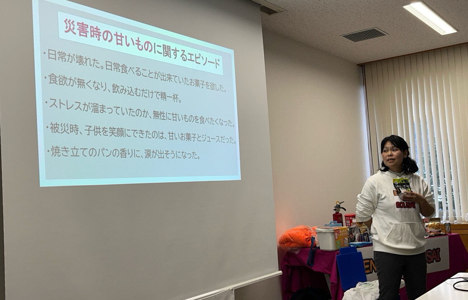 セミナーでは、非常食は「非常時だけのもの」ではなく、日常の食事に取り入れることで無理なく備えることができる、また、「災害時×甘いもの」のエピソードから、甘い非常食は空腹を満たすだけでなく、心の安定にもつながる重要な役割を果たすことをお話いただきました。さらに、西谷先生から、災害時に「ピンクやイエローなどの明るい色を見て心が晴れた」という声を受け、非常食は中身だけでなく、気持ちを明るくするパッケージデザインにも配慮しているというお話もありました。